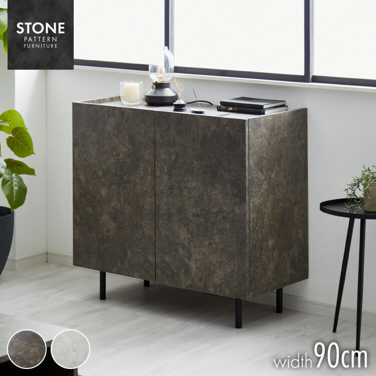 キャビネット ストーン調 幅90cm チェスト リビングボード 開き扉 セラミック調 グレー 収納棚 サイドボード サイドチェスト サイドキャビネット テレビ台 ハイタイプ 脚付き スチール脚