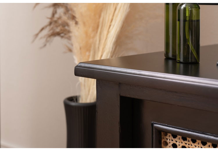 ●温かみがありながら、クールな印象も与えるブラックのウッド素材と、モダンな雰囲気のある天然ラタンの組み合わせは重厚感あるブラックにラタンのベージュが差し色になり、お部屋に圧迫感を与えず抜け感のあるトレンド感溢れるデザインに。