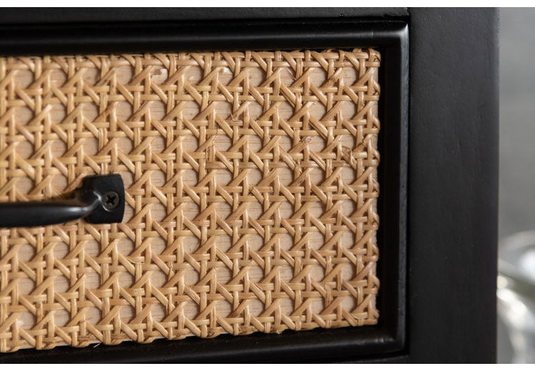 ●温かみがありながら、クールな印象も与えるブラックのウッド素材と、モダンな雰囲気のある天然ラタンの組み合わせは重厚感あるブラックにラタンのベージュが差し色になり、お部屋に圧迫感を与えず抜け感のあるトレンド感溢れるデザインに。