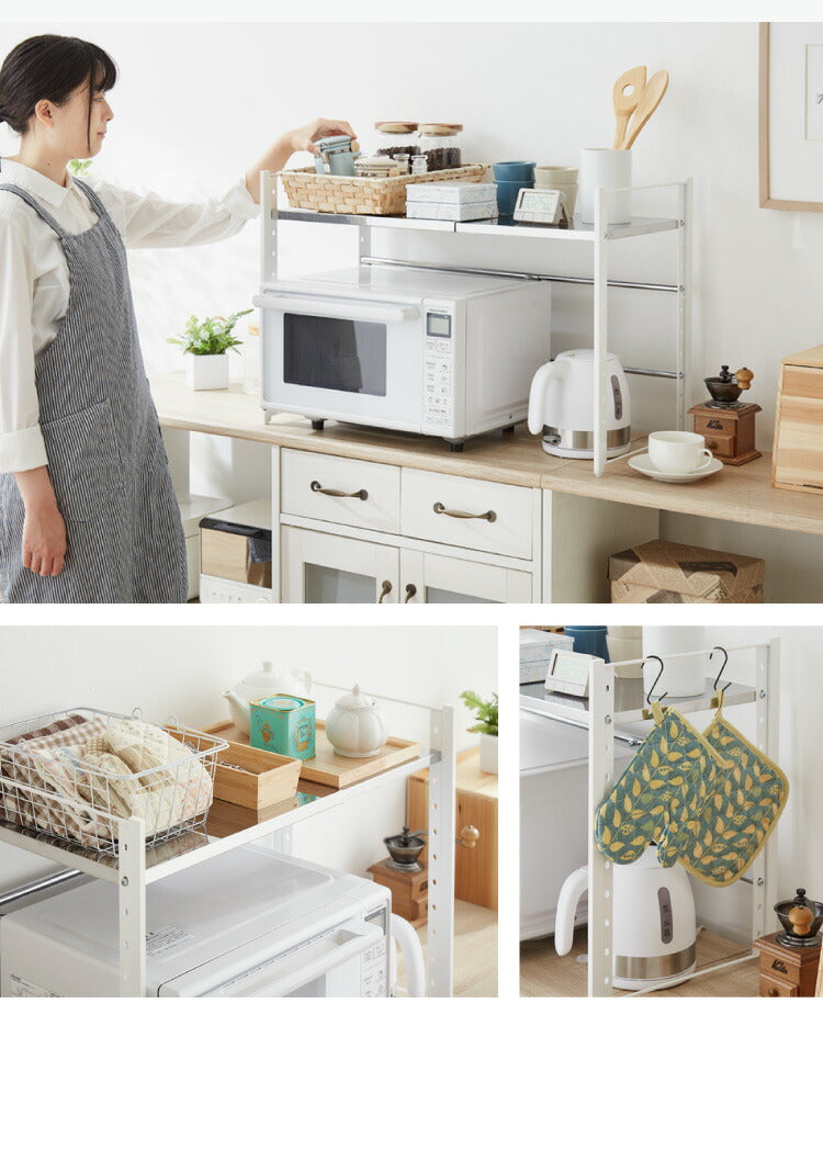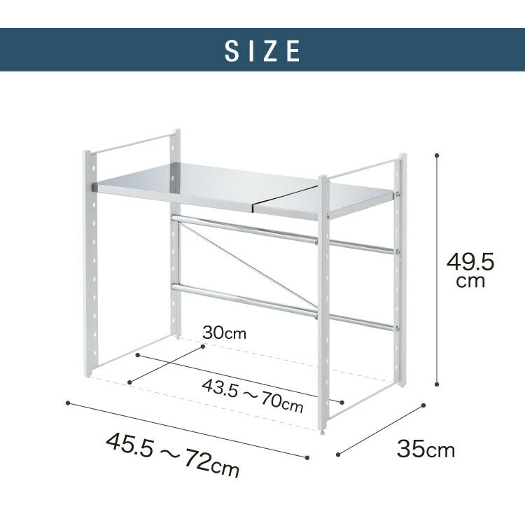 日本製 燕三条 伸縮レンジ上ラック 1段 ステンレス棚 キッチン家電をまとめて収納! 幅45.5~72 高さ調節 キッチンラック レンジ上 伸縮 棚 電子レンジ 家電上ラック カウンター上収納(代引不可)