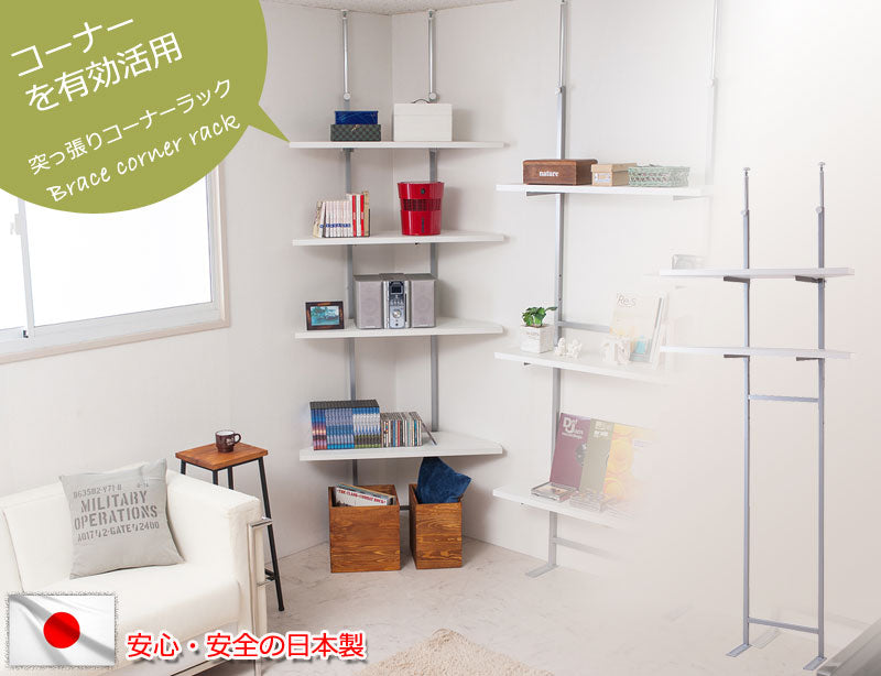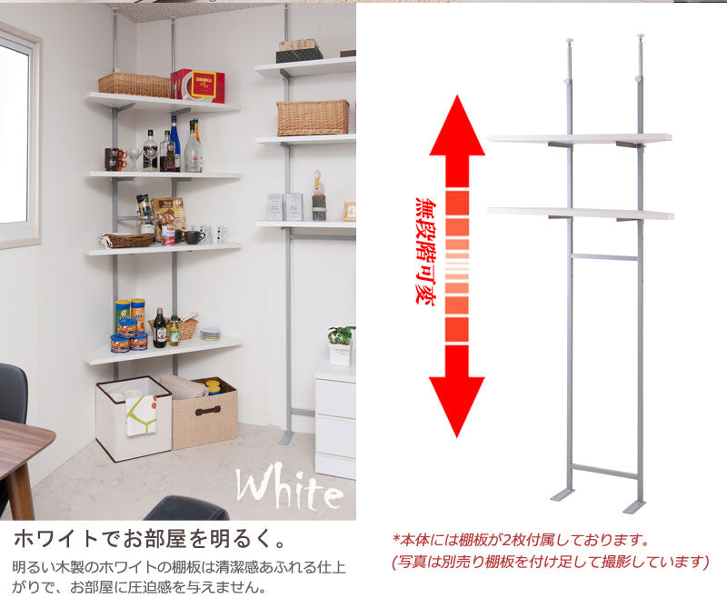■商品について/無段階に棚板の位置を調節できる突っ張りウォールシェルフにコーナーラックが登場!棚板の位置を無段階に調節でき、自分の丁度いい高さに設定することができます。