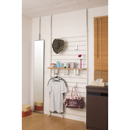本体:(約)幅95(上部突っ張り部96)×奥行き20×高さ200~260cm 棚板可動間隔:(約)8.5cm 棚板サイズ:(約)幅89.5×奥行17.5×厚み2cm フック出幅:14cm |