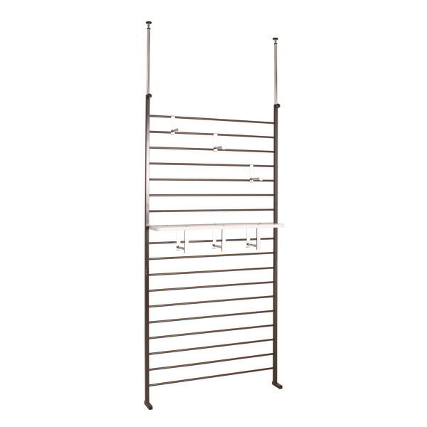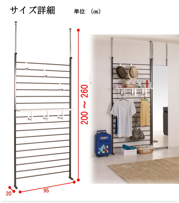本体:(約)幅95(上部突っ張り部96)×奥行き20×高さ200~260cm 棚板:幅89.5×奥行17.5×厚み2cm 棚板可動間隔約8.5cm フック出幅14cm 本体:スチール(エポキシ粉体塗装) 棚板:プリント紙化粧繊維板 付属品:フック3個、棚板(ハンガー付)1枚 耐荷重量/棚板:約3kg、フック約1kg 商品重量:18kg 日本製